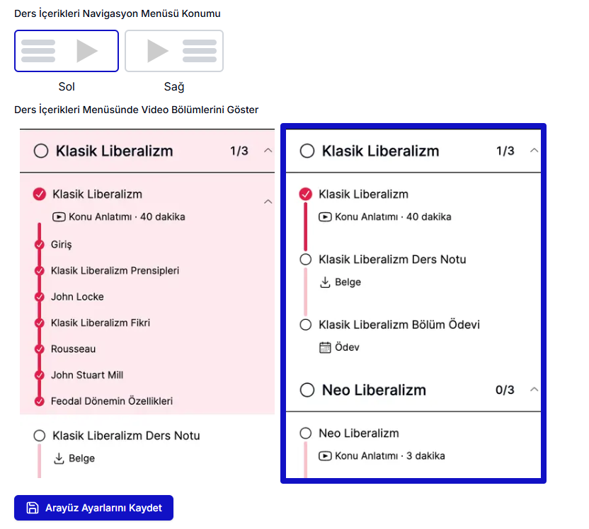 • Ders içerikleri navigasyon menüsünü Sol veya Sağ olarak konumlandırabilir, video bölümlerinin görünürlüğünü açıp kapatabilirsiniz.