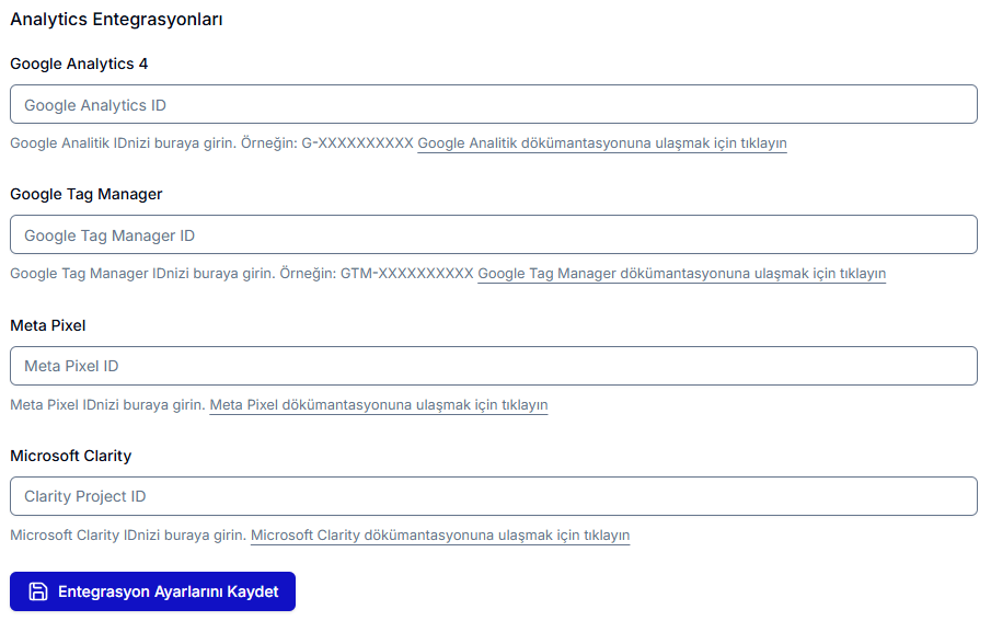 Organizasyonunuz için oluşturduğunuz web sitenizin ziyaretçi trafiğini, kullanıcı davranışlarını ve pazarlama performansınızı doğru şekilde ölçebilmeniz için gerekli izleme araçlarını Analytics Entegrasyonları sağlar.