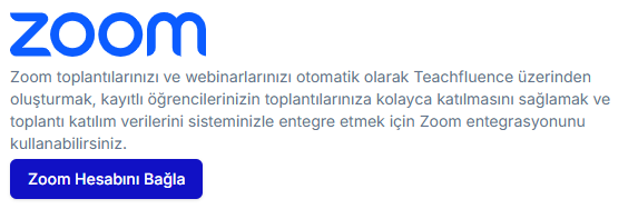 Toplantı ve webinarlarınızı Teachfluence üzerinden otomatik olarak oluşturmak ve katılımcı verilerini sisteminize entegre etmek için Zoom entegrasyonunu kullanabilirsiniz. Zoom entegrasyonu hakkında detaylı bilgi almak için Zoom Entegrasyonu sayfasını ziyaret edebilirsiniz.