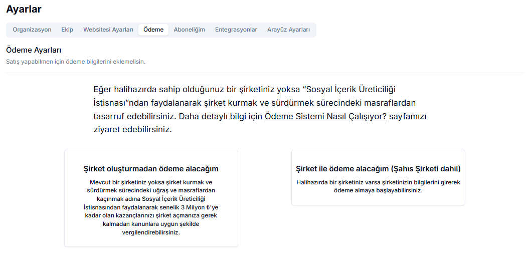 Mevcut bir şirketiniz varsa, şirket bilgilerinizi girerek ödemeleri doğrudan alabilirsiniz. Şahıs veya limited şirket fark etmeksizin ödeme yapılabilir.