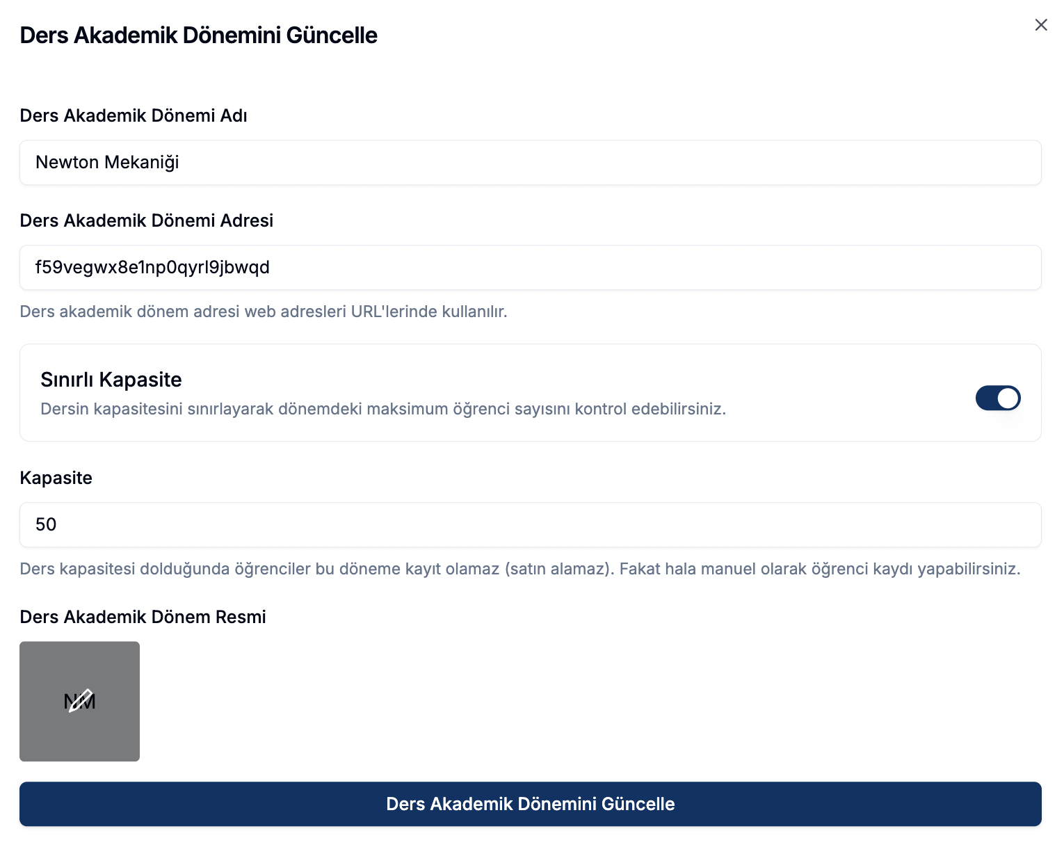 "Ders Akademik Dönem Ayarları" başlığının yanında bulunan "Güncelle" butonuna tıkladıktan sonra açılan panelden dersin akademik dönem adını, arama çubuğuna gözükecek dersin akademik dönem adresini (URL), dersin kapasitesini ve akademik dönem fotoğrafını güncelleyebilirsiniz. Eğer dersiniz için bir kapasite sınırı koymak isterseniz, sınırlı kapasite ayarını aktif ettikten sonra aşağıda beliren kapasite kutucuğunda sınırı belirtebilirsiniz. Bunun yanı sıra ders akademik dönem fotoğrafını bilgisayarınızdaki dosyalardan veya bilgisayar kamerasından o an çekerek seçebilirsiniz. Burada belirleyeceğiniz fotoğraf ders sayfasında gözükecektir.