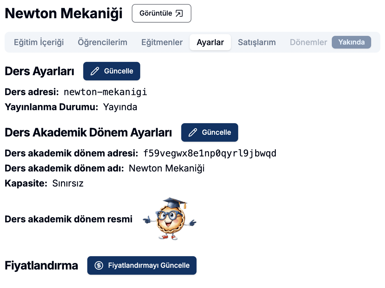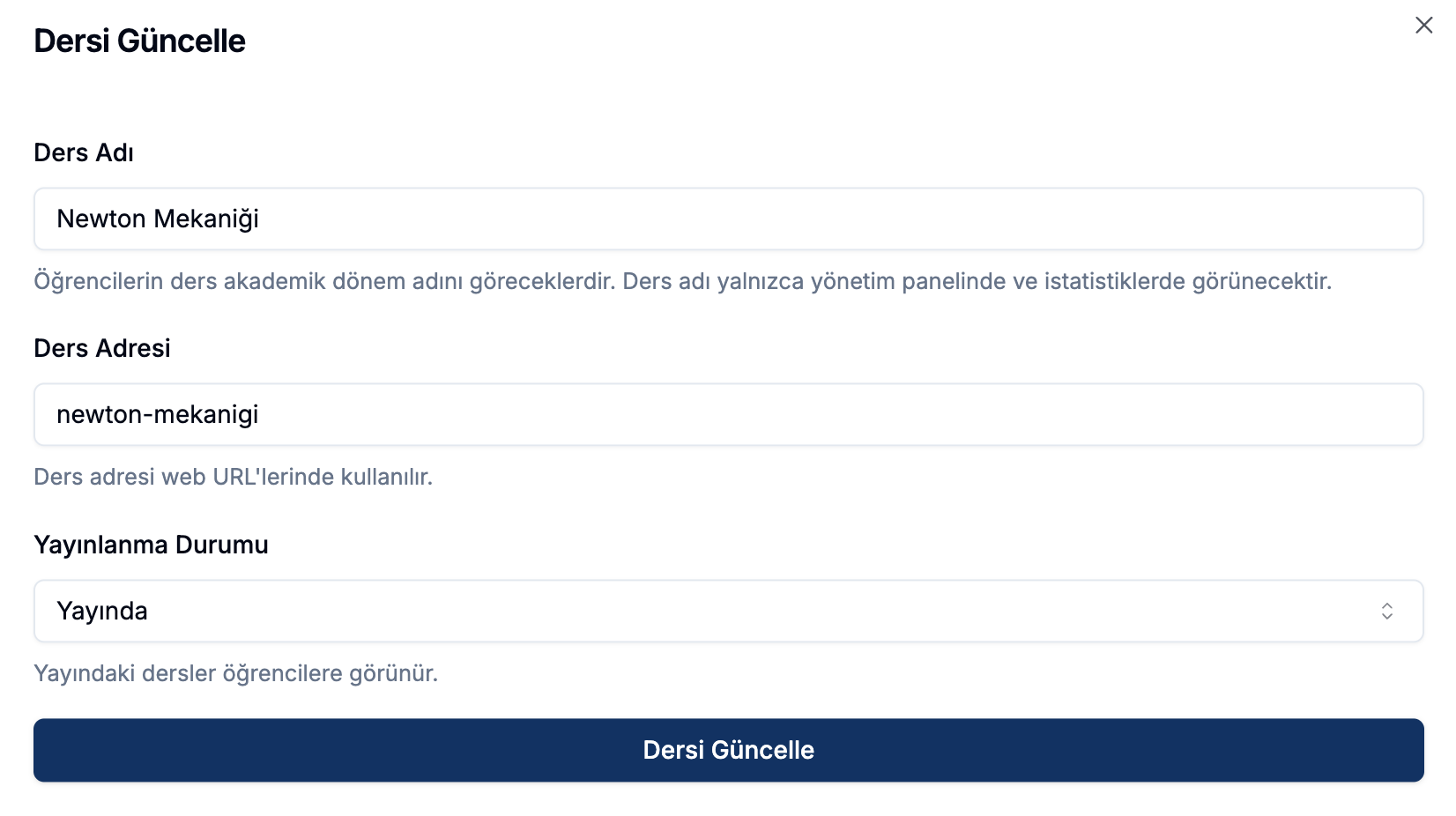 "Ders Ayarları" başlığının yanında bulunan "Güncelle" butonuna tıkladıktan sonra açılan panelden ders adını, arama çubuğuna gözükecek dersin adresini (URL) ve dersin yayınlanma durumunu güncelleyebilirsiniz.