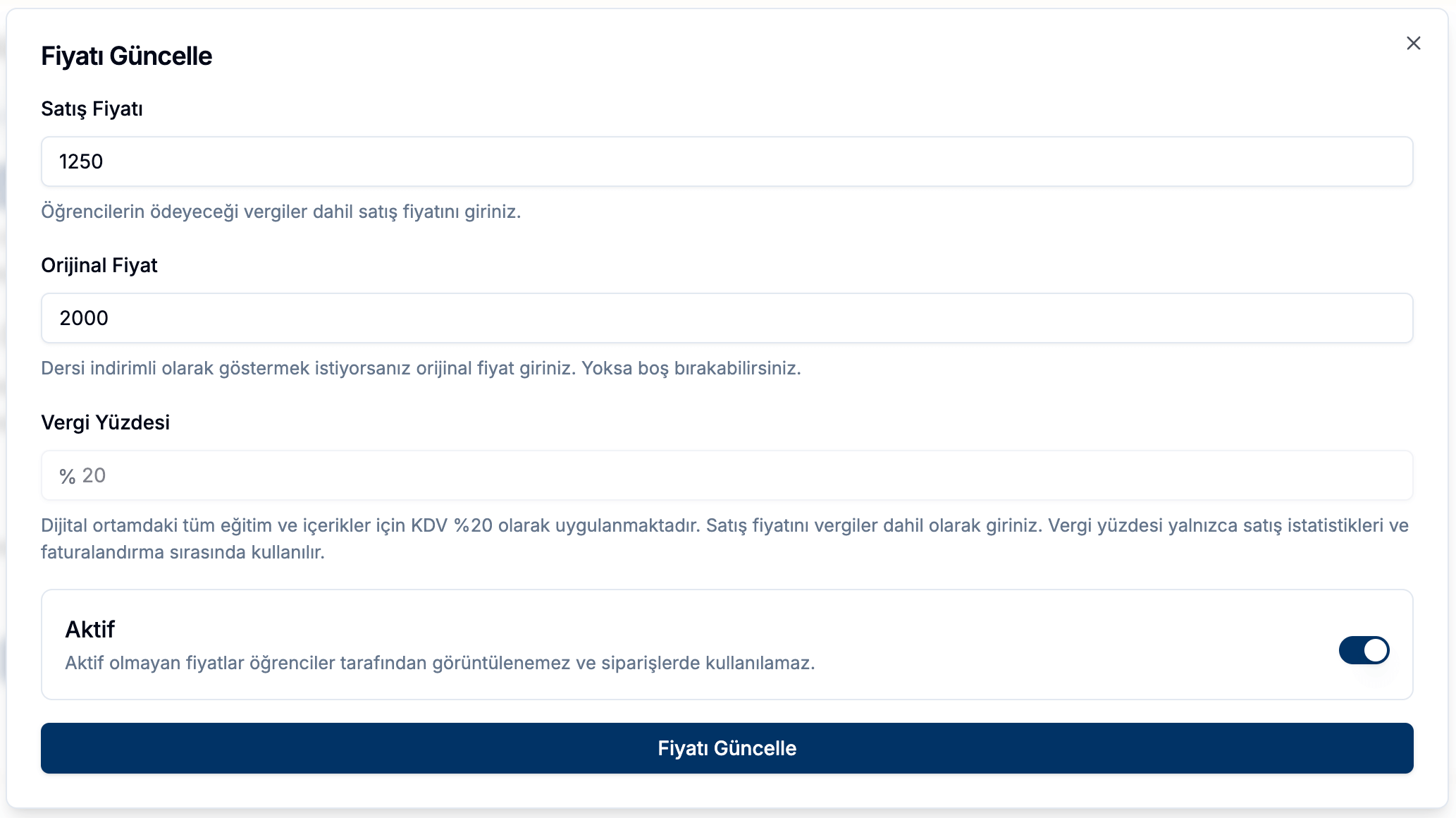 Fiyatlandırma bölümündeki "Fiyatlandırmayı Güncelle" butonuna tıkladıktan sonra açılan panelden fiyatlandırmayı güncelleyebilirsiniz.