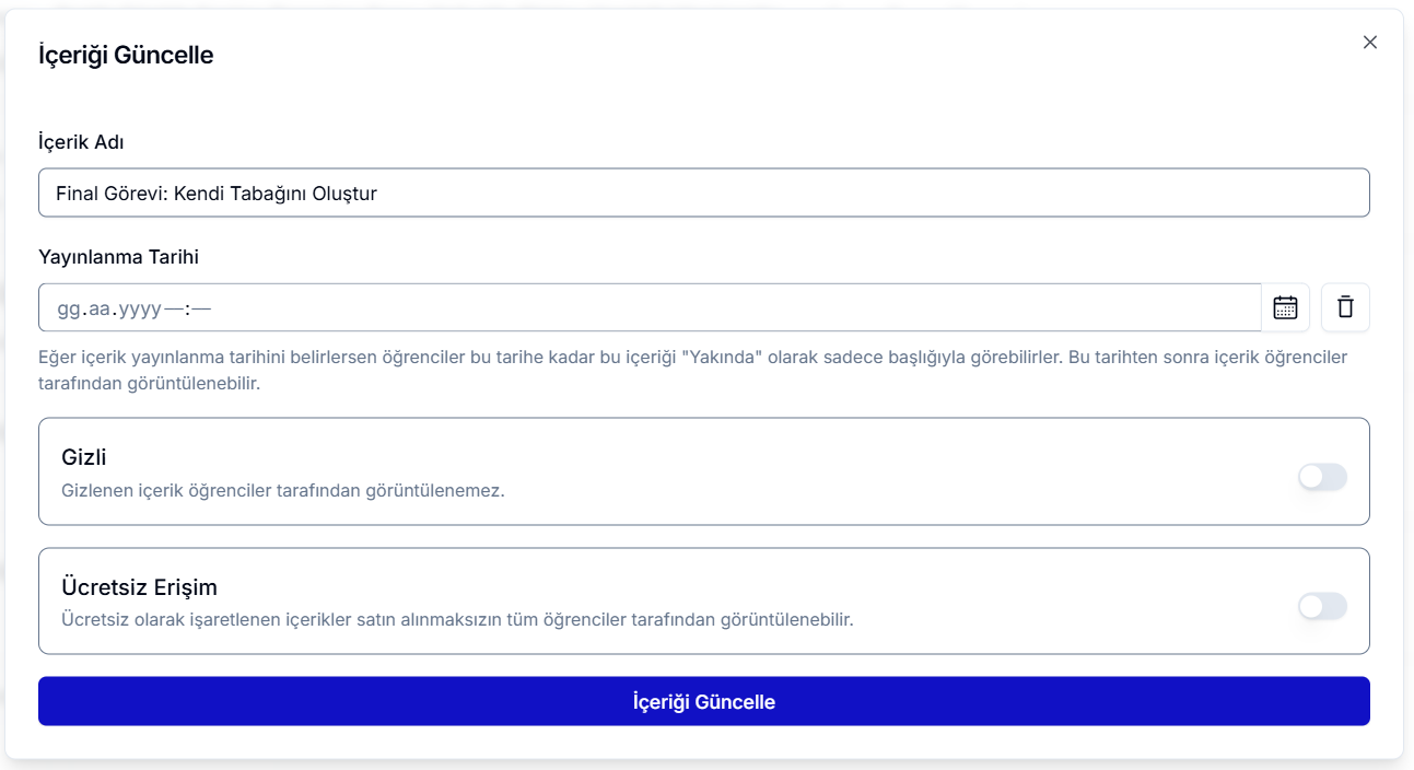 Kalem İkonu: Ödevin adını, yayınlanma tarihini, öğrenciler için gizlilik durumunu ve ücretsiz erişim ayarlarını günceller. Yayınlanma tarihi düzenlenirse, öğrenciler ödevin açıklamasını belirlenen tarihe kadar göremezler ve içerik sayfasında ödevin hangi tarihten itibaren görüntülenebileceğine dair bir bilgilendirme yer alır. Ücretsiz erişim açılırsa, dersinize kayıtlı olmayan öğrenciler de ödevin açıklamasını görüntüleyebilir. Bu özellik, dersinizin demosunu potansiyel öğrencilere göstermek için idealdir.
