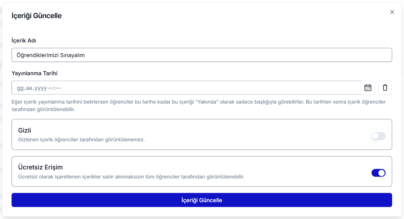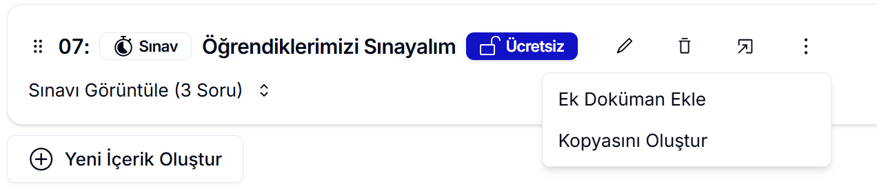 1. Kalem İkonu: Sınavın adını, yayınlanma tarihini, öğrenciler için gizlilik durumunu ve ücretsiz erişim ayarlarını güncellemenizi sağlar. Yayın tarihi düzenlenirse, öğrenciler sınavı belirlediğiniz tarihe kadar çözemez ve sayfada sınavın hangi tarihte erişime açılacağına dair bir bilgilendirme görür. Ücretsiz erişim açılırsa, dersi satın almayan öğrenciler de sınavı çözebilir.