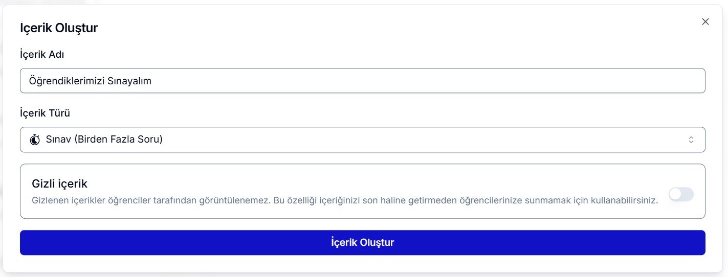 Sınav oluşturmak için ilgili bölümün altındaki Yeni İçerik Oluştur butonuna tıklayın. Açılan panelden içerik türünü Sınav (Birden Fazla Soru) olarak seçin ve sınavınıza bir isim verin. Bu panelde ayrıca Gizli İçerik seçeneğini kullanarak sınavın öğrenciler tarafından ne zaman görüleceğini belirleyebilirsiniz. Bu seçenek, sınavın tamamlanmadan öğrenciler tarafından erişilmesini engellemek için kullanışlıdır.