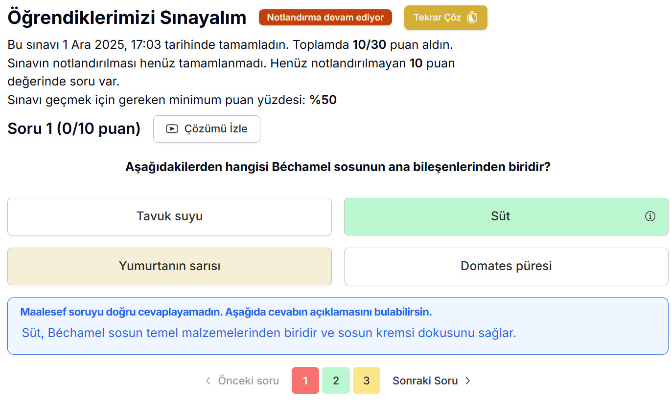 Sorularınızın her biri için ekranda görünen uyarıların üzerine tıklayarak, çözüm videolarını dış bir kaynaktan veya bilgisayarınızdan yükleyebilir ve öğrencilerle paylaşabilirsiniz. Ayrıca, soruların yanındaki kalem ikonuna tıklayarak soru ve cevaplarda değişiklik yapabilir, çöp kutusu ikonu ile de soruyu sınavınızdan kaldırabilirsiniz.