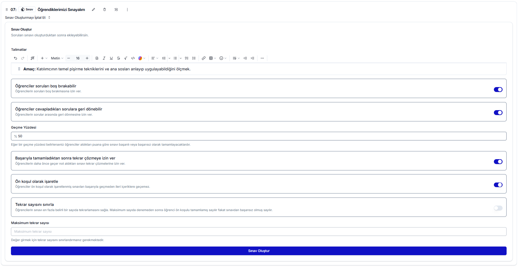 5. Sınavı Tekrar Çözme Hakkı: Bu seçeneği aktif ederseniz, öğrenciler sınavı başarılı olarak tamamlamış olsalar bile tekrar çözebilirler.
