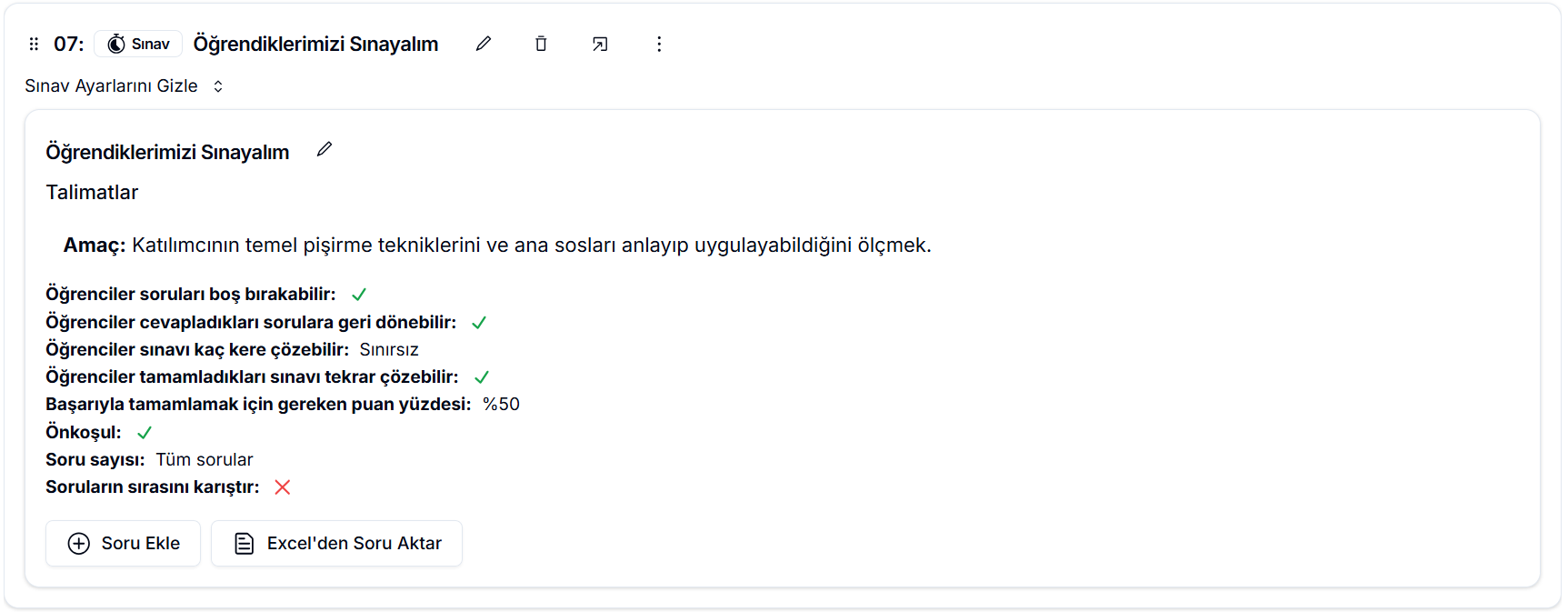 Sorularınızı ekledikten sonra, sınavınızın özet bilgileri panelde aşağıdaki şekilde görüntülenecektir.