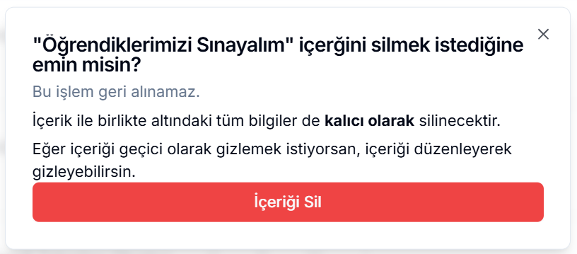 1. Çöp Kutusu İkonu: Sınavı kalıcı olarak dersinizden kaldırmak için kullanılır. Bu ikona tıkladıktan sonra açılan İçeriği Sil butonunu kullanarak sınavı silebilirsiniz.