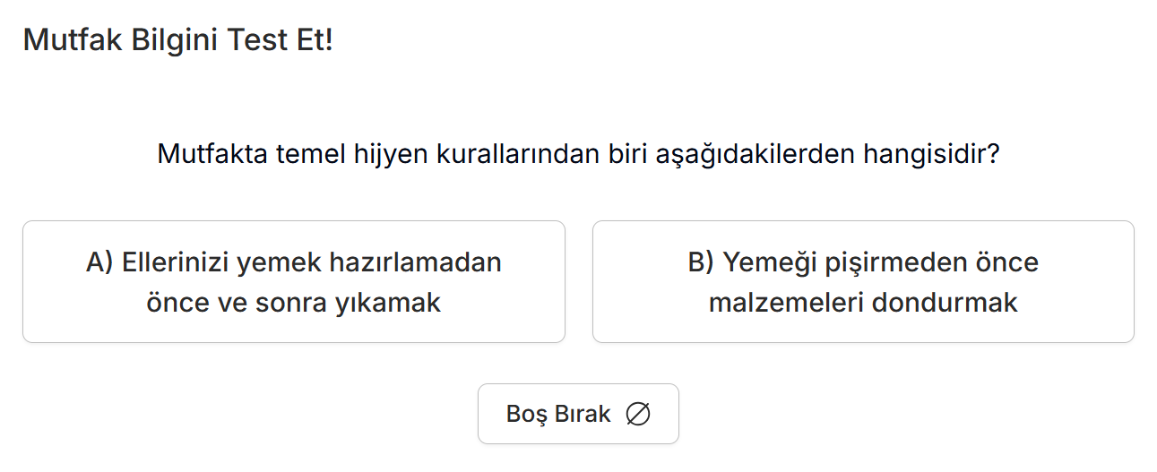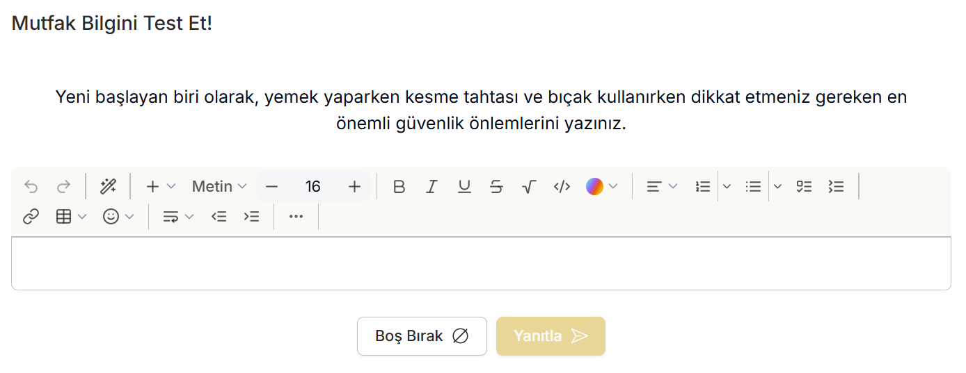 Çoktan Seçmeli Soru tipinde bir quiz oluşturmak için öncelikle sorunun açıklamasını yazabilir ve ihtiyaç duyduğunuz tüm şıkları zengin metin editörü üzerinden ekleyebilirsiniz. Tüm şıkları oluşturduktan sonra doğru cevabı belirlemek için ilgili şıkkın yanındaki “Doğru Cevap Olarak Seç” butonunu kullanabilir, gereksiz veya fazla eklenmiş şıkları temizlemek için “Sil” seçeneğinden yararlanabilirsiniz.