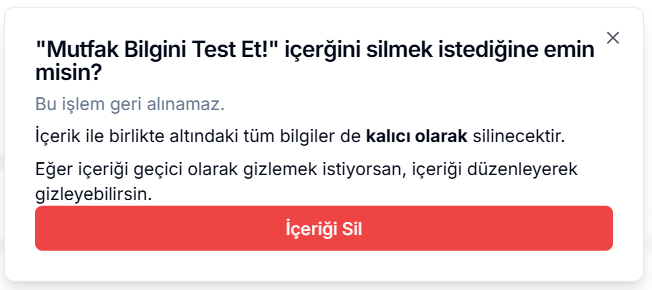 Çöp Kutusu İkonu: Soruyu kalıcı olarak silmek için kullanılır. Bu ikona tıkladığınızda açılan panelden İçeriği Sil butonuna basarak soru tamamen kaldırılır.
