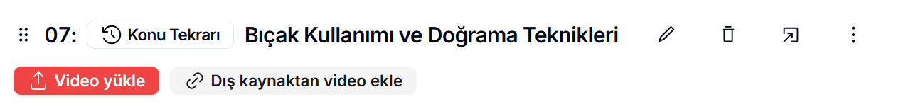 İçerik Oluştur butonuna bastıktan sonra, bölümün altında oluşturduğunuz yeni içeriği görebilirsiniz. Ancak henüz video yüklemediğiniz için içerik bu hâliyle eksik olacaktır. Bu aşamada dilerseniz videonuzu bir dış kaynaktan (ör. YouTube, Vimeo) ekleyebilir veya kendi bilgisayarınızdan istediğiniz videoyu yükleyebilirsiniz.