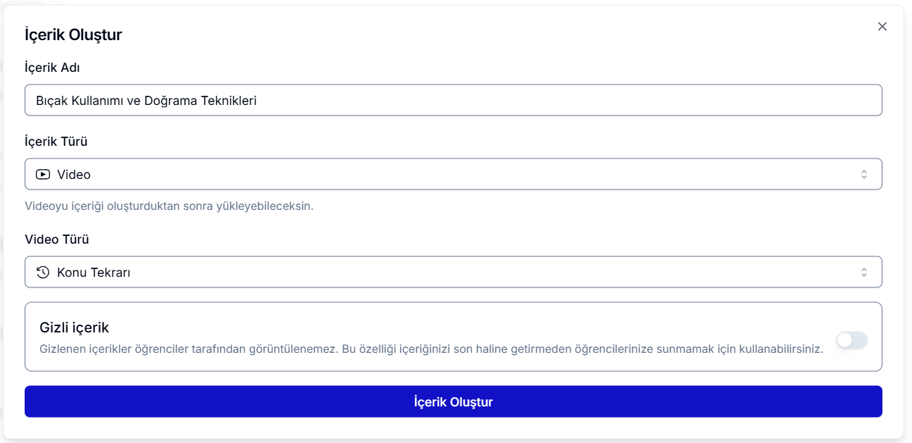 Dersinize video eklemek için, ilgili bölümün altındaki “Yeni İçerik Oluştur” butonuna tıklayın. Açılan panelden içerik türünü Video olarak seçip videonuza bir isim vererek başlayabilirsiniz. Ardından videonuzun türünü Ders Anlatımı veya Konu Tekrarı olarak belirleyebilirsiniz.