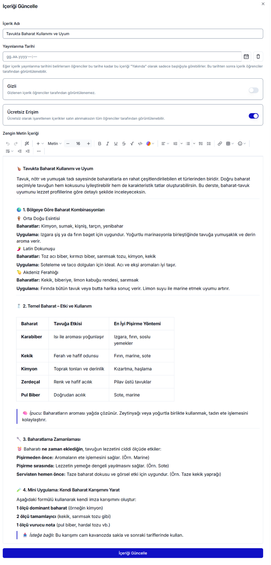 Ayrıca panelin üst kısmındaki ayarlar üzerinden içeriğinizin yayınlanma tarihini, gizlilik durumunu değiştirebilir ve isterseniz içeriği potansiyel öğrenciler için ücretsiz hale getirebilirsiniz.