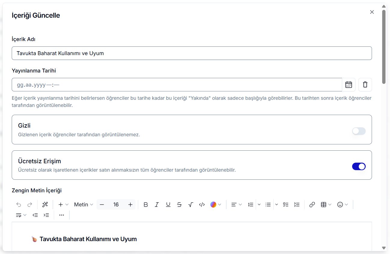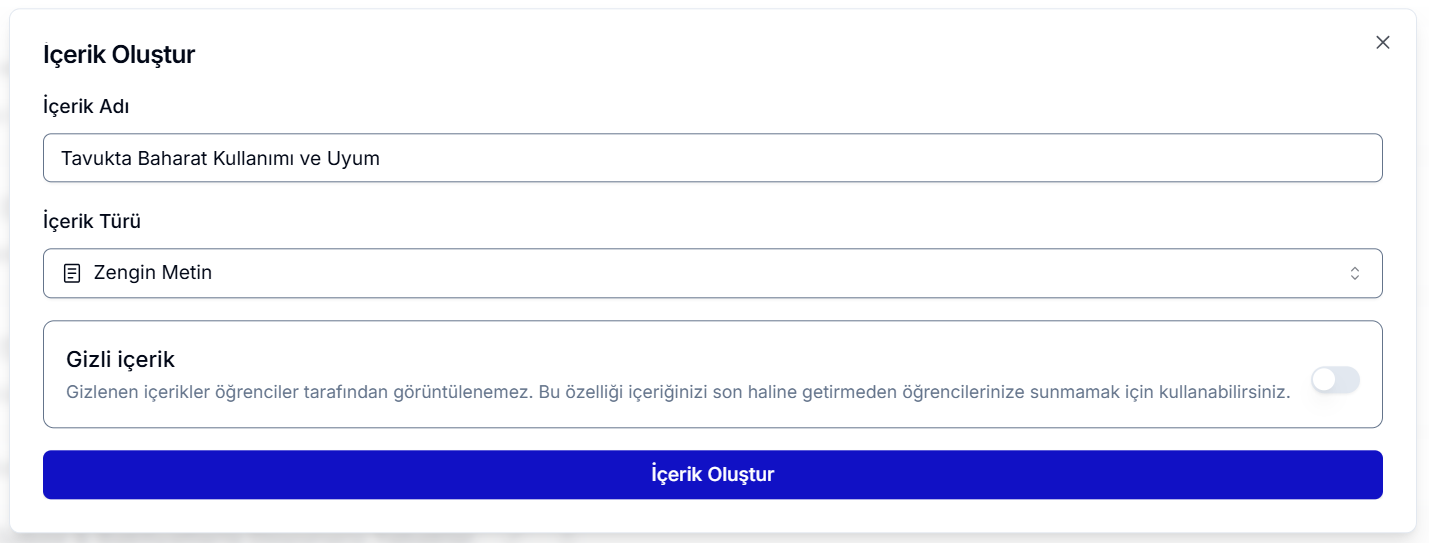 Bir zengin metin oluşturmak için, ilgili bölümün altındaki Yeni İçerik Oluştur butonuna tıkladıktan sonra açılan panelden içerik türü olarak Zengin Metin seçmeniz ve metne bir isim vermeniz yeterlidir. Bu panelde ayrıca oluşturduğunuz içeriğin öğrenciler tarafından görüntülenip görüntülenmeyeceğini Gizli İçerik seçeneği üzerinden ayarlayabilirsiniz.