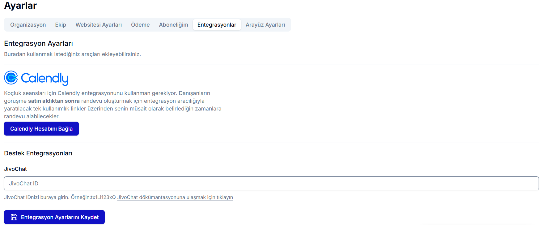 JivoChat tarafından size verilen kodda yer alan ID'yi Teachfluence panelinizde Ayarlar → Entegrasyonlar → Destek Entegrasyonları → JivoChat alanına yapıştırıp Entegrasyon Ayarlarını Kaydet butonuna tıkladığınızda JivoChat entegrasyonunuz tanımlanır.