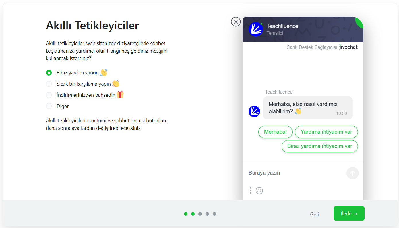 Akıllı tetikleyiciler, web sitenizin ziyaretçileri ile kolayca sohbet başlatmanıza yardımcı olur. Ziyaretçilerinize ileteceğiniz ilk mesajı isteğinize göre belirleyebilirsiniz.