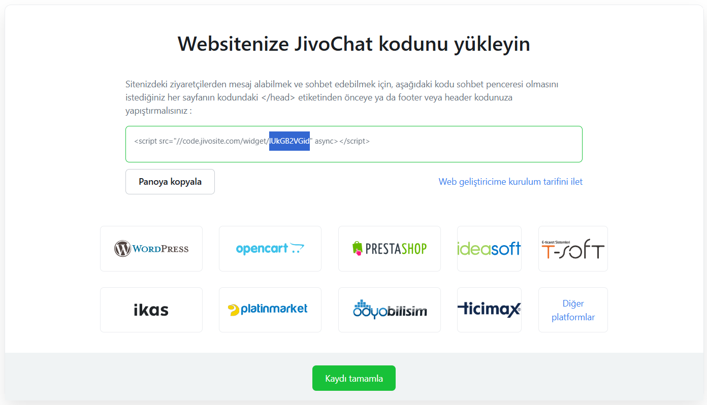 Kurulumun sonunda JivoChat tarafından size web sitenizin ziyaretçileri ile sohbet edebilmek için gereken kod ve ID bilgisi verilmektedir. Bu kodda yer alan ID’yi Teachfluence panelinizde entegrasyonu sağlamak için kullanacaksınız.