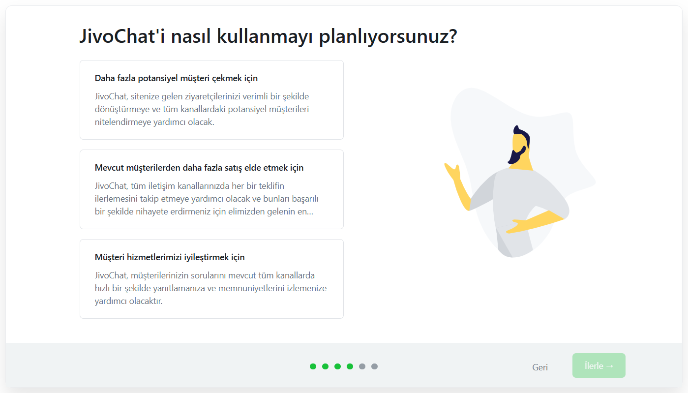 Sonraki adımda JivoChat’i web sitenizde hangi amaçla kullanacağınızı belirleyebileceğiniz bir ekran yer alıyor.