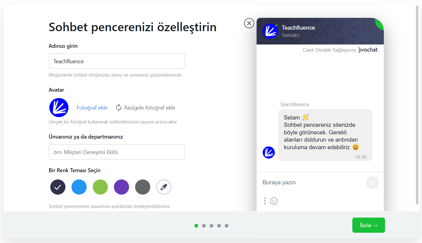 Bu ekranda yer alan gerekli alanları (adınız ve avatarınız) doldurduktan sonra isteğinize göre renk temasını da değiştirebilirsiniz. Bunları gerçekleştirdiğinizde ekranda sohbet pencerenizin önizlemesi yer alacaktır.
