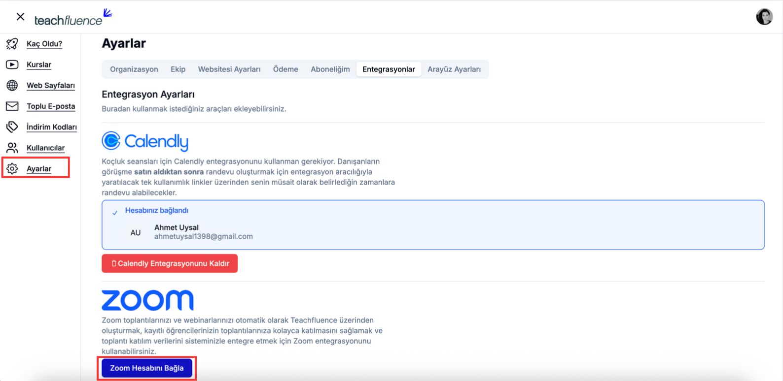 Zoom hesabınızı Teachfluence'a bağlamak için Ayarlar → Entegrasyonlar → Zoom Hesabını Bağla butonuna tıkladıktan sonra entegrasyonun tamamlanması için bir sayfaya yönlendirileceksiniz.