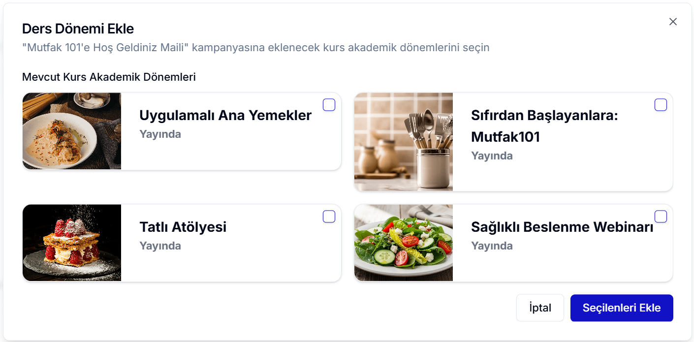 • Ders Dönemi Ekle seçeneği, kampanyaya belirli kurs akademik dönemlerini dahil etmenizi sağlar. Mevcut dönemler listelenir ve istediğiniz dönemleri seçip Seçilenleri Ekle butonuyla kampanyaya ekleyebilirsiniz.