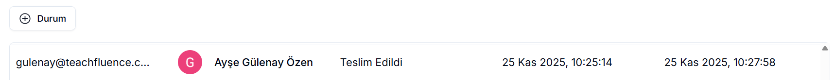 Bu alanda kampanya kapsamında gönderilen her bir e-postanın detaylarını inceleyebilirsiniz. Bu bölümde alıcının e-posta adresi, öğrenci bilgileri, gönderim durumu (teslim edildi, gönderiliyor, gönderildi, beklemede, geri döndü, başarısız, taslak), gönderim tarihi ve varsa açılma tarihi listelenir. Böylece tüm gönderimlerin performansını kolayca takip edebilirsiniz.