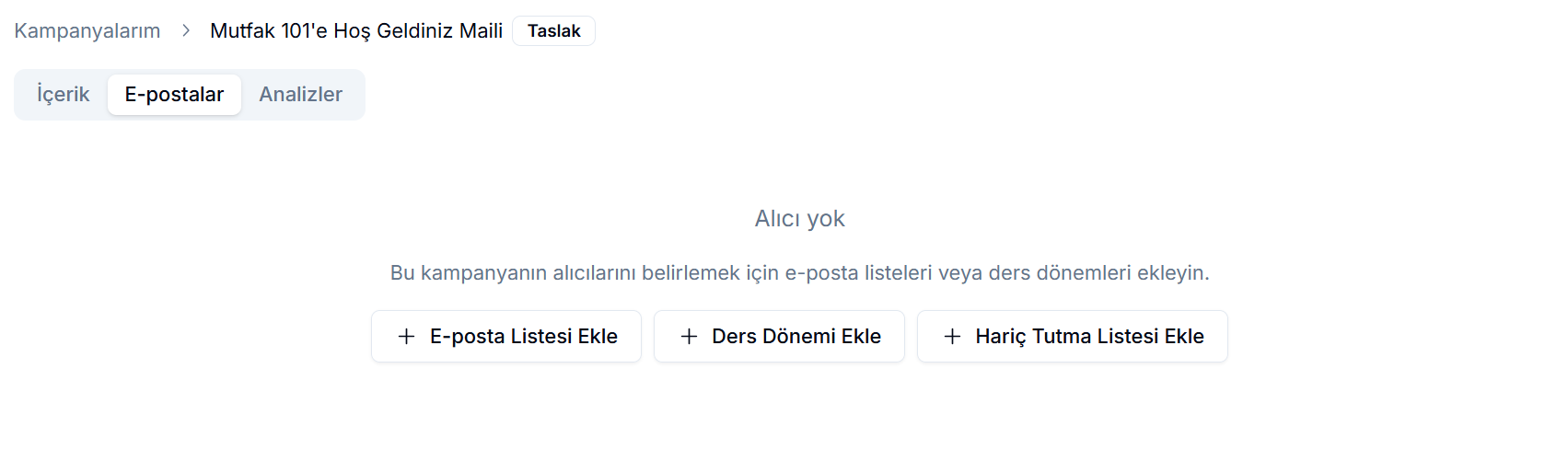 Kampanyanıza alıcı eklemek veya hariç tutmak için kullanabileceğiniz üç temel seçenek bulunur: E-posta Listesi Ekle, Ders Dönemi Ekle ve Hariç Tutma Listesi Ekle.