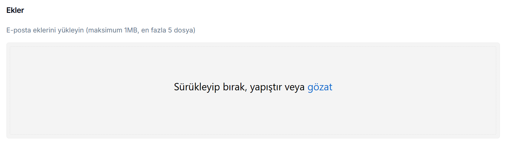 • Ekler: Bu bölümden e-postanıza dosya ekleri yükleyebilirsiniz. E-postanıza yalnızca 1 MB ve altındaki büyüklükte ve en fazla 5 dosyayı ek olarak ekleyebilirsiniz. Daha büyük dosyalar için dosya paylaşım platformu (Google Drive, vb.) linki eklemenizi öneriyoruz.
