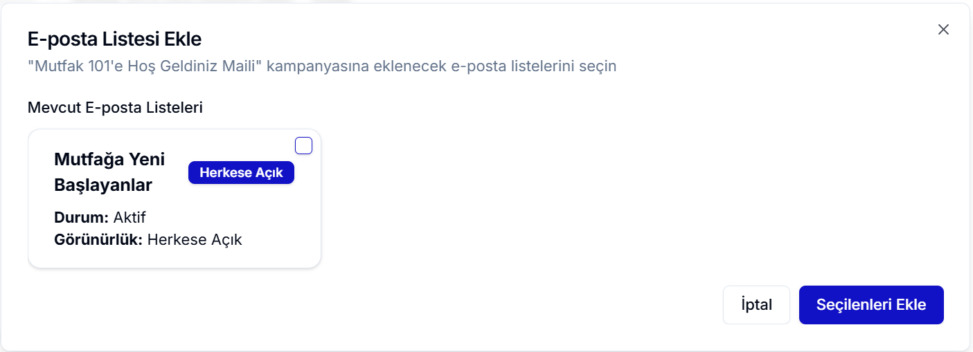 • E-posta Listesi Ekle seçeneği ile, mevcut e-posta listelerinizi görüntüleyebilir ve kampanyaya dahil etmek istediğiniz listeyi seçebilirsiniz. Kullanmak istediğiniz listeyi belirledikten sonra Seçilenleri Ekle butonuyla ekleme işlemini tamamlayabilirsiniz.