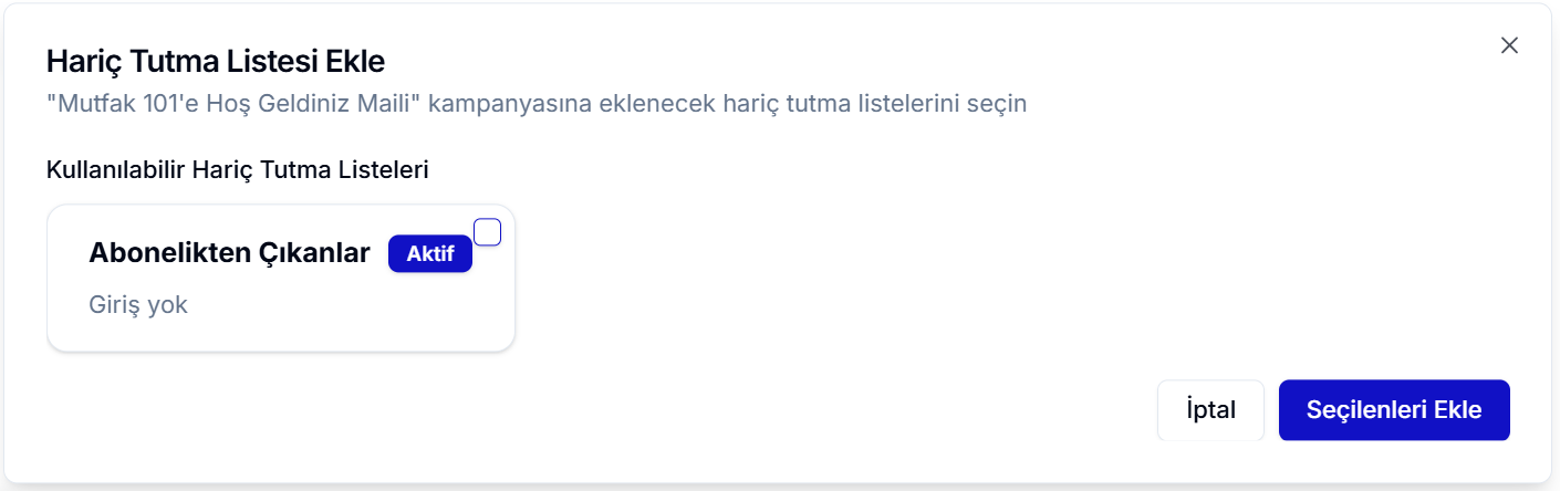 • Hariç Tutma Listesi Ekle seçeneği ile kampanyadan çıkarılmasını istediğiniz alıcı gruplarını belirleyebilirsiniz. Kullanılabilir Hariç Tutma Listeleri görüntülenir, uygun listeyi seçerek yine Seçilenleri Ekle butonu ile işlemi tamamlayabilirsiniz.