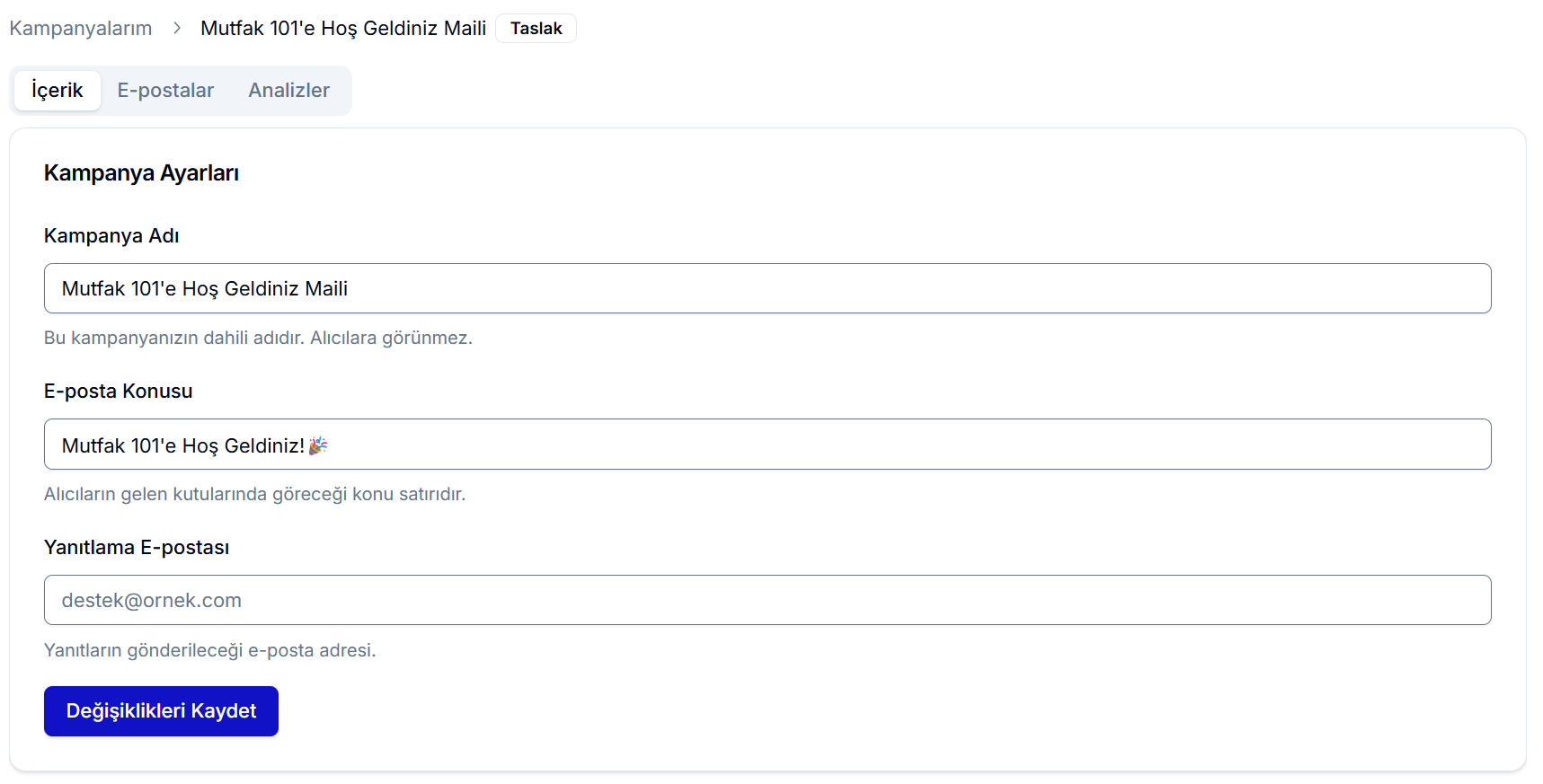 • Kampanya Ayarları: Bu bölümde yalnızca sizin görebileceğiniz kampanya adını düzenleyebilir, alıcıların gelen kutularında görüntülenecek konu satırını belirleyebilir ve yanıtların hangi e-posta adresine yönleneceğini ayarlayabilirsiniz. Yaptığınız tüm düzenlemeleri Değişiklikleri Kaydet butonuyla onaylayabilirsiniz.