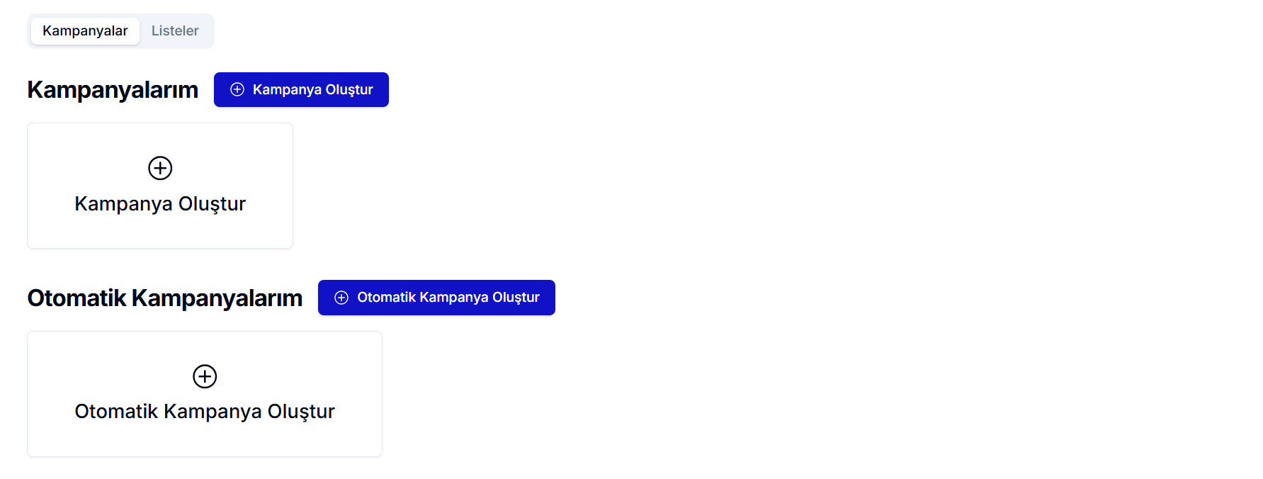Kampanyalarım bölümü, manuel olarak oluşturduğunuz tüm e-posta kampanyalarının listelendiği alandır. Bu bölümden yeni bir kampanya başlatabilir, taslaklarınız üzerinde çalışabilir veya henüz gönderilmemiş kampanyalarınızı düzenlemeye devam edebilirsiniz.