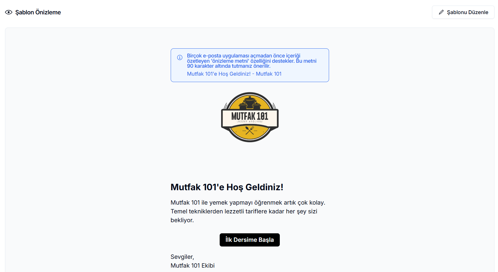 Mail tasarımınızı tamamladıktan sonra Kaydet butonu ile tüm değişikliklerinizi kaydedebilir, Şablonu Önizle butonu ile oluşturduğunuz mailin önizlemesini görüntüleyebilirsiniz.