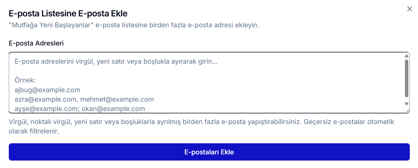 - Oluşturduğunuz e-posta listesine birden fazla e-posta adresi ekleyebilirsiniz.