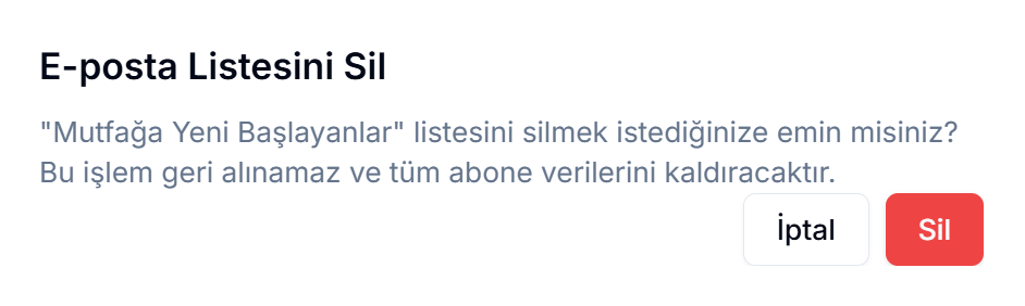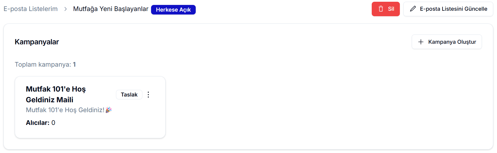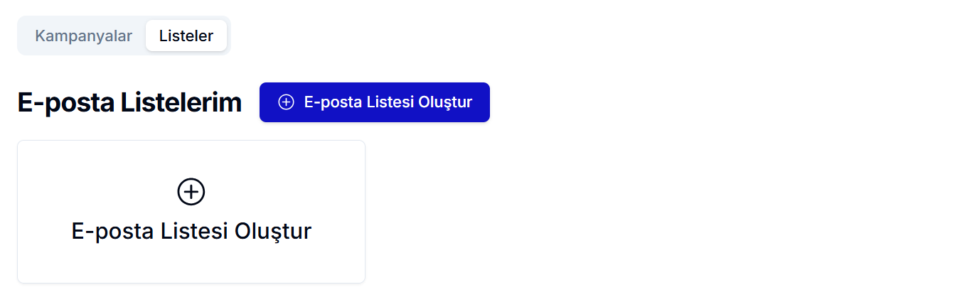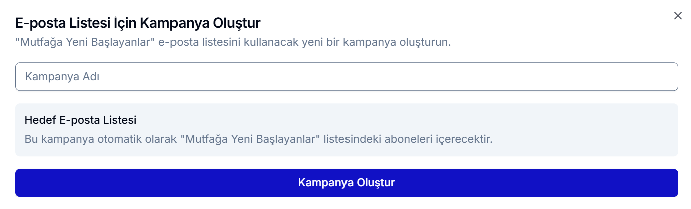 - E-posta Listesi İçin Kampanya Oluştur: Oluşturduğunuz e-posta listesine bağlı yeni bir kampanya oluşturmanızı sağlar.