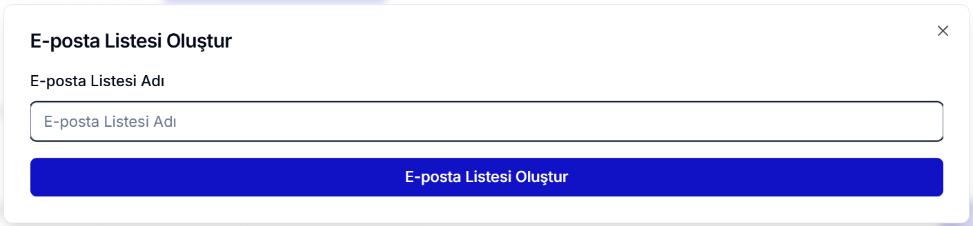 Yeni bir e-posta listesi oluşturmak için E-posta Listesi Oluştur butonuna tıklayın. Açılan pencerede oluşturmak istediğiniz listenin adını doldurduktan sonra liste oluşturma işlemini onaylayabilirsiniz.