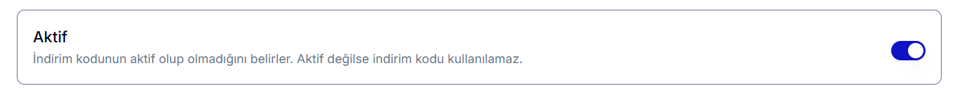 Bu ekranda, oluşturma aşamasında tanımlanan tüm alanlara ek olarak iki önemli ayar daha bulunur. Aktiflik Durumu, indirim kodunun kullanılabilir olup olmadığını belirler; pasif konuma getirilen indirim kodları ödeme ekranında kullanılamaz.