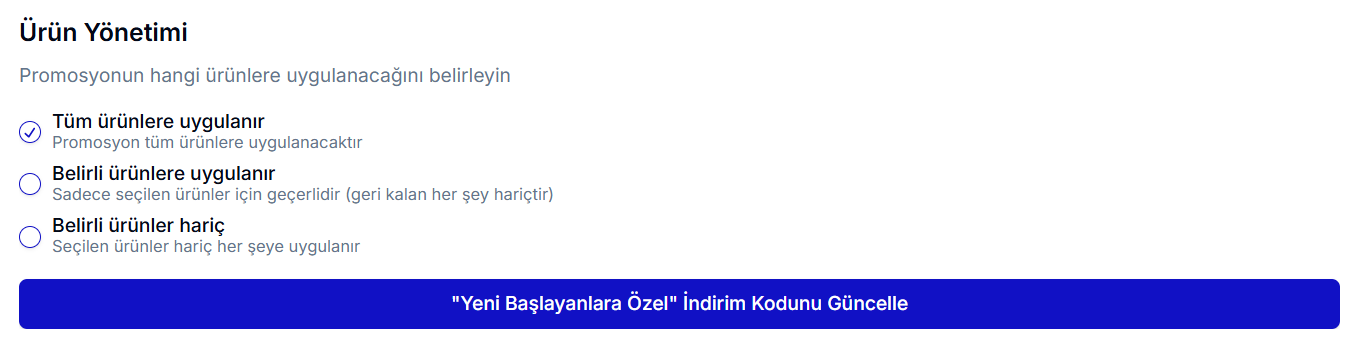 Ürün Yönetimi bölümünde ise indirimin hangi ürünlerde geçerli olacağını belirlersiniz. Bu alanda indirimi tüm ürünlere, yalnızca belirli ürünlere veya belirli ürünler hariç olacak şekilde sınırlayabilirsiniz.