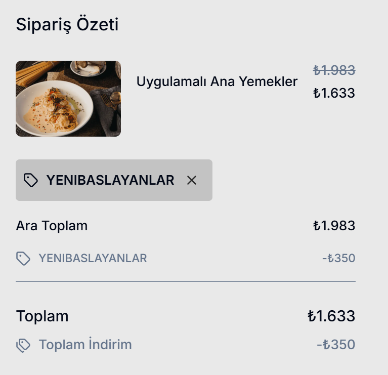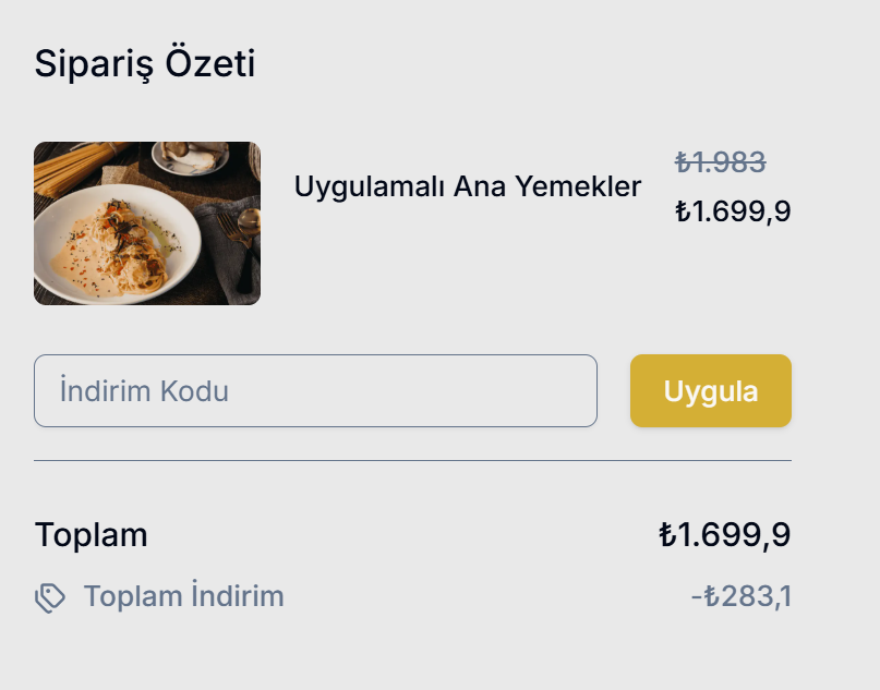 Kullanıcı, bu alana oluşturulan kupon kodunu girip Uygula butonuna tıkladığında indirim otomatik olarak sepete yansıtılır.